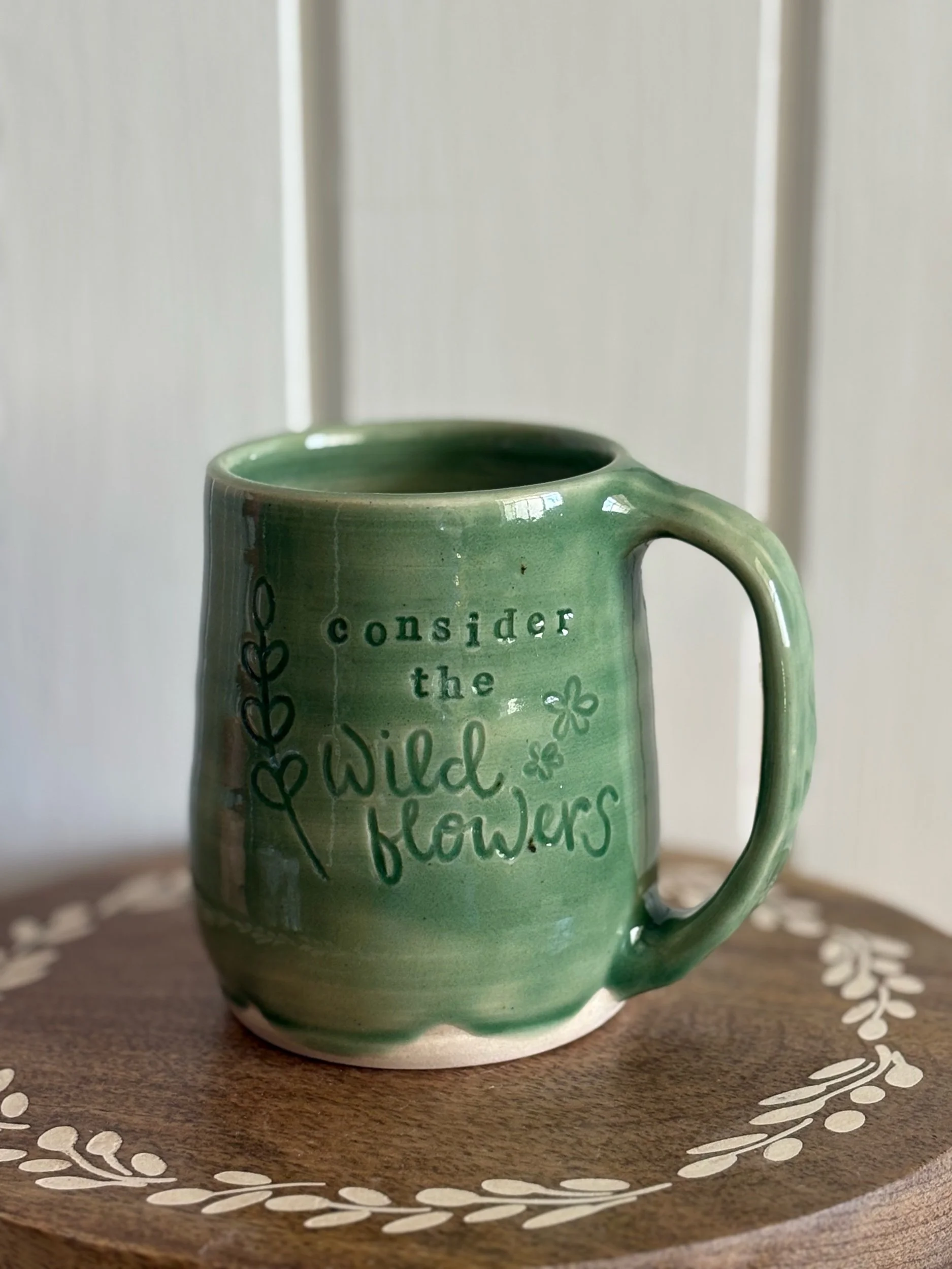 Handmade ceramic mug with ‘consider the wildflowers’ craved. Holds approximately 15oz of your favorite beverage. Microwave and dishwasher safe.