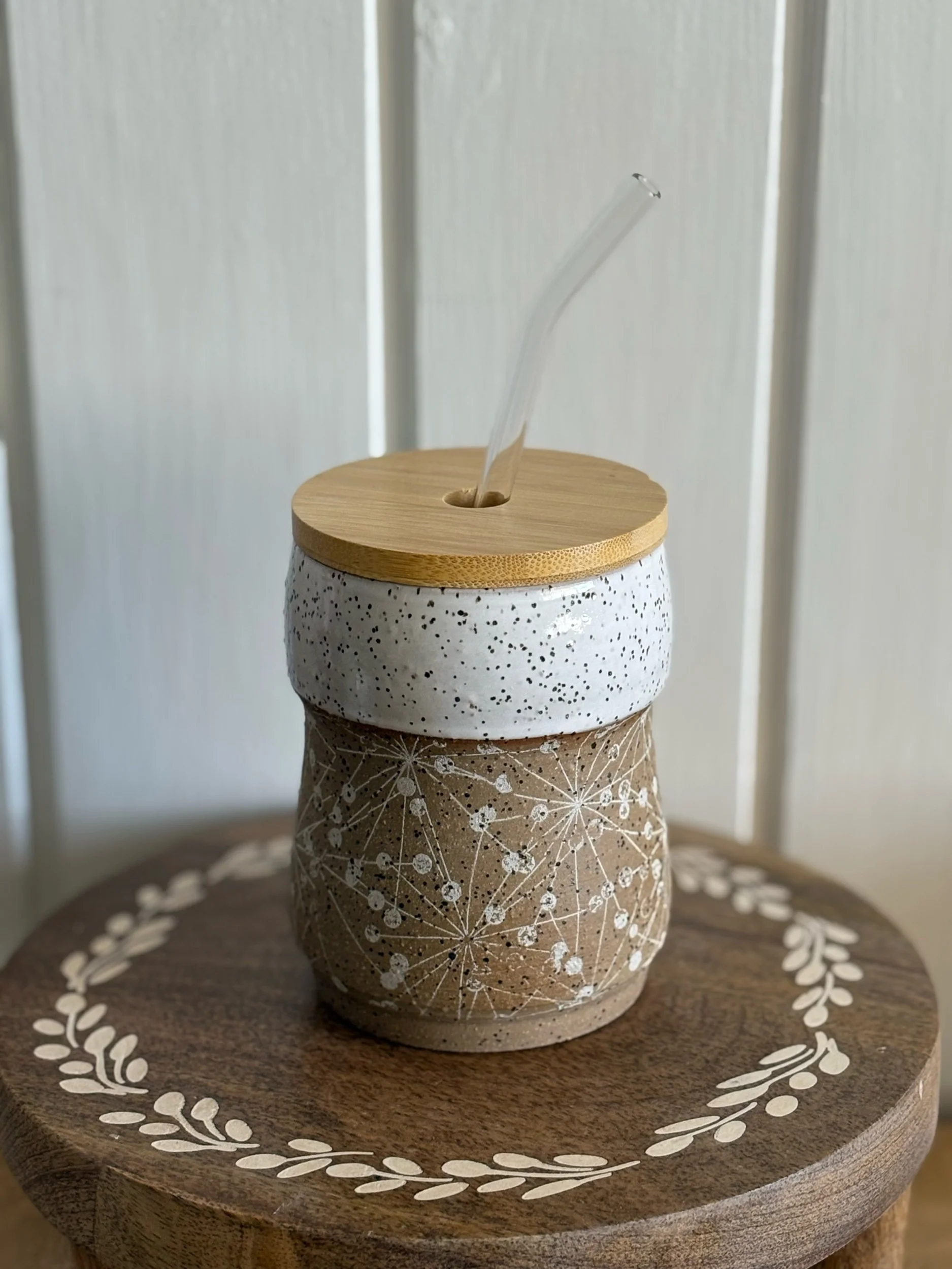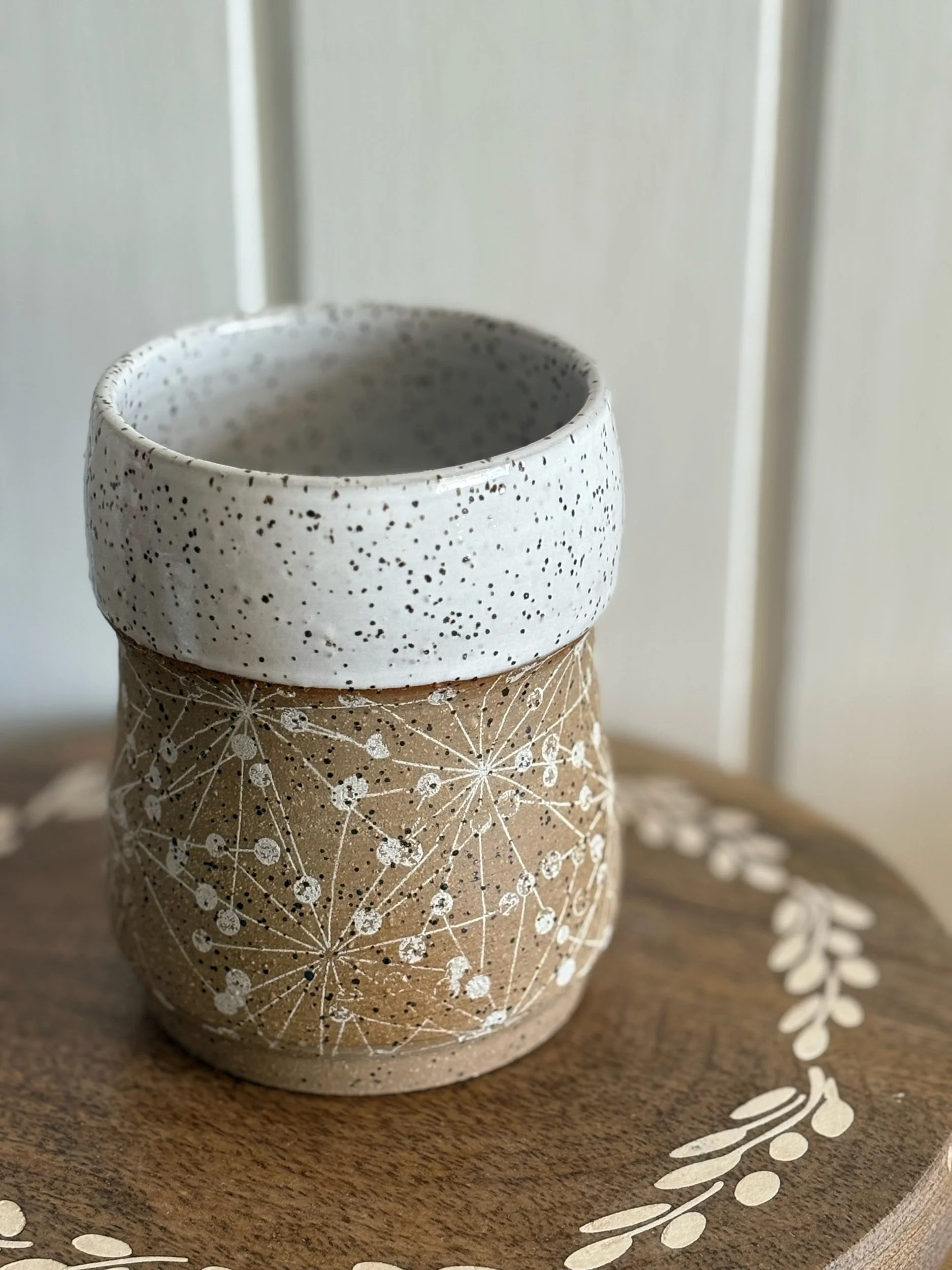 Handmade ceramic tumbler with firework underglaze detail. Holds approximately 16oz of your favorite drink. Microwave and dishwasher safe.