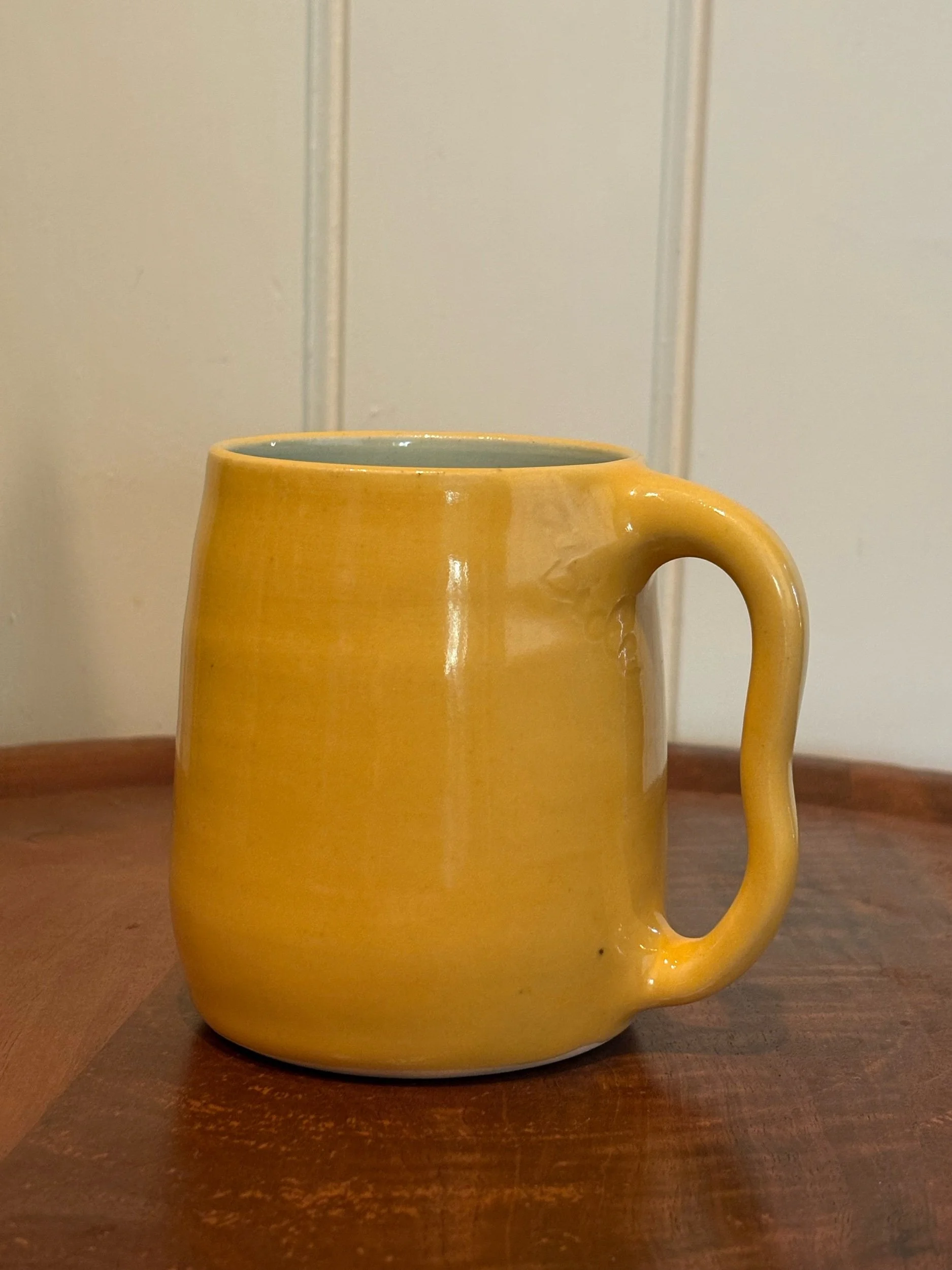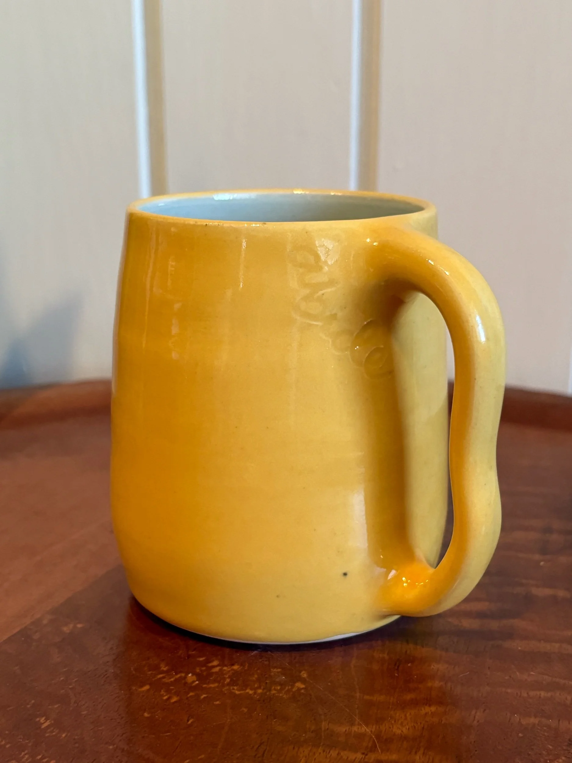 Handmade ceramic mug with abide detail along handle. Yellow outside. Light blue inside. Holds approximately 13 oz. Microwave and dishwasher safe
