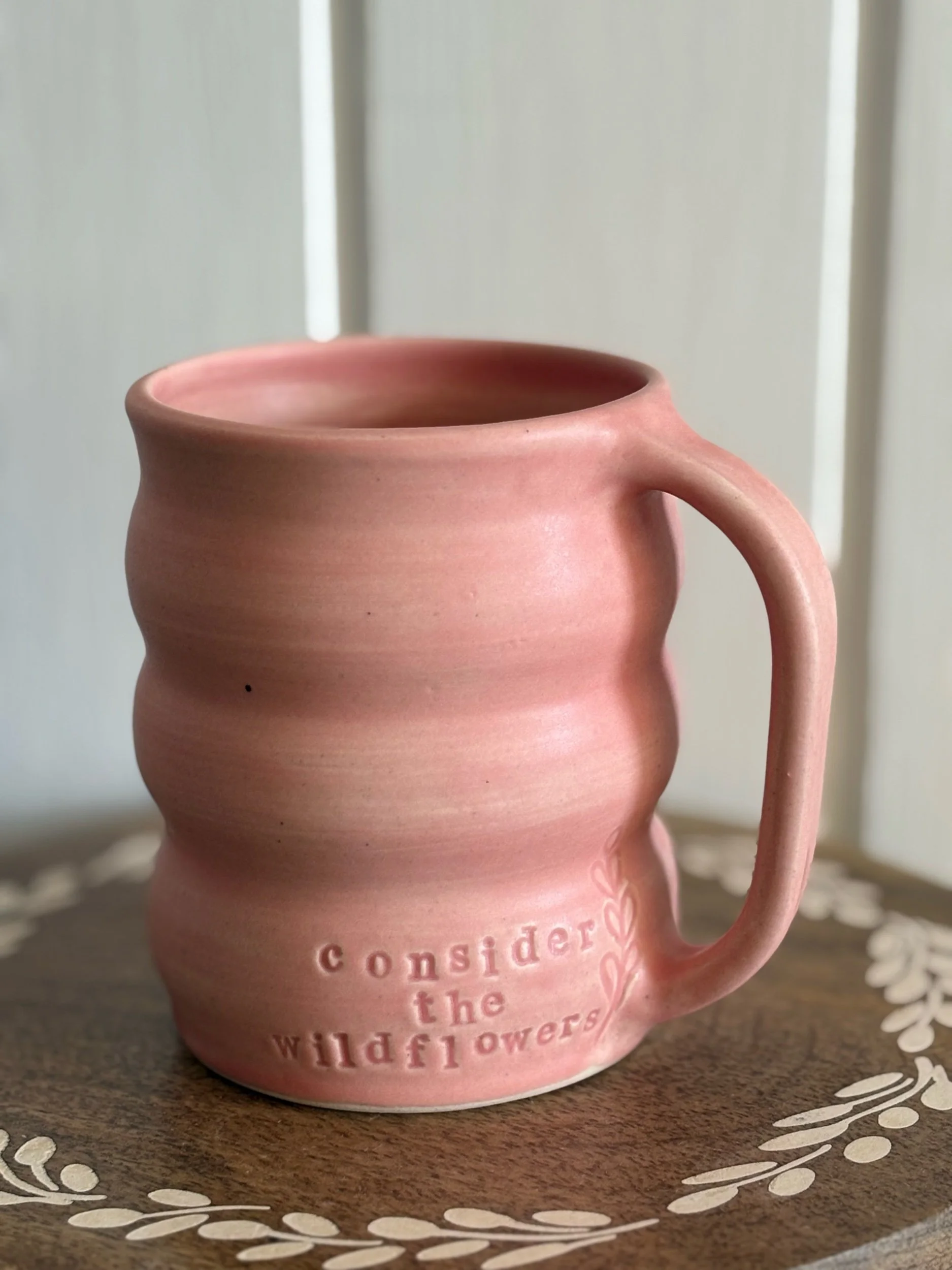 Handmade ceramic mug with ‘consider the wildflowers’ stamped along bottom. Holds approximately 16oz of your favorite beverage. Microwave and dishwasher safe.