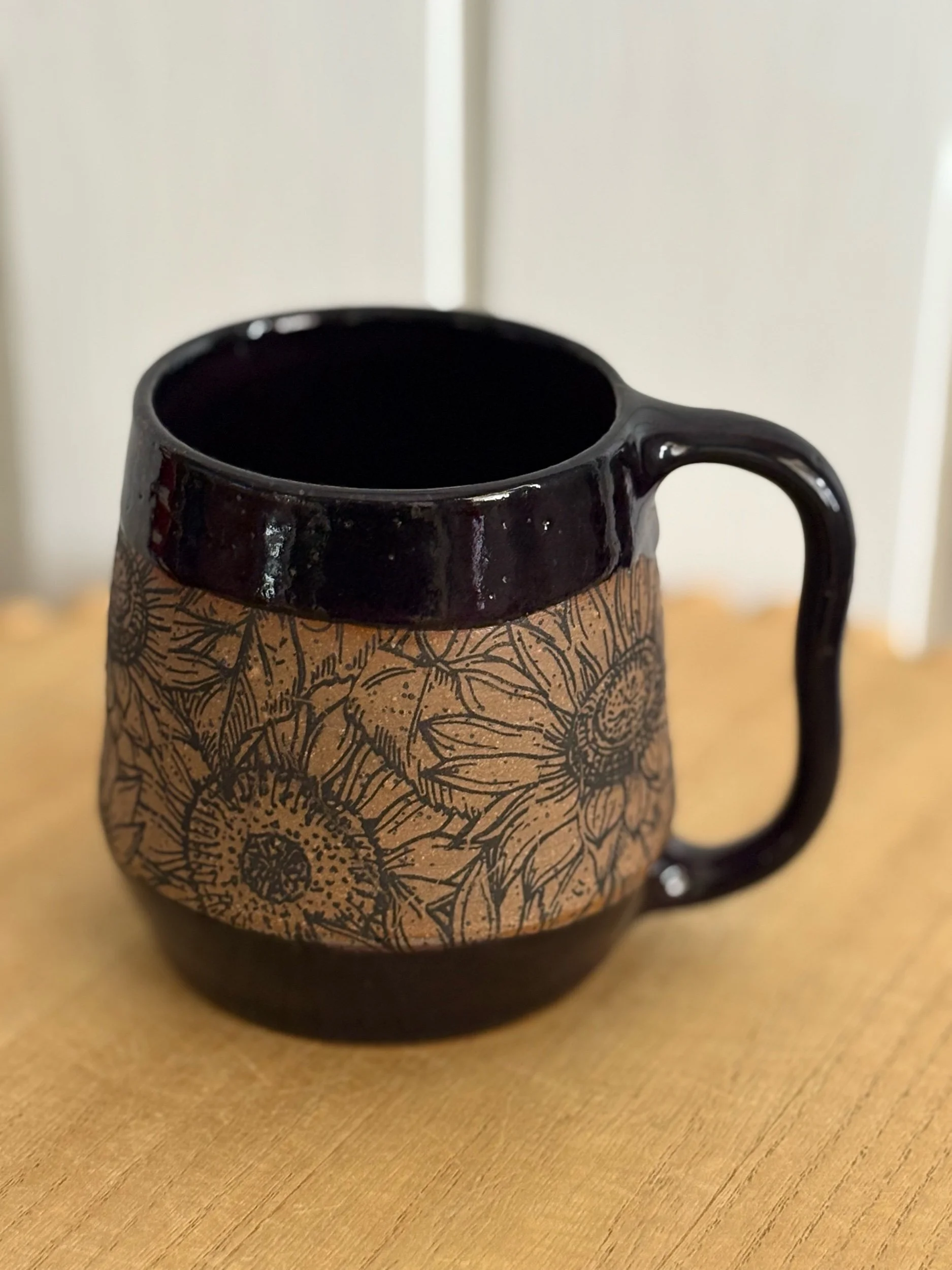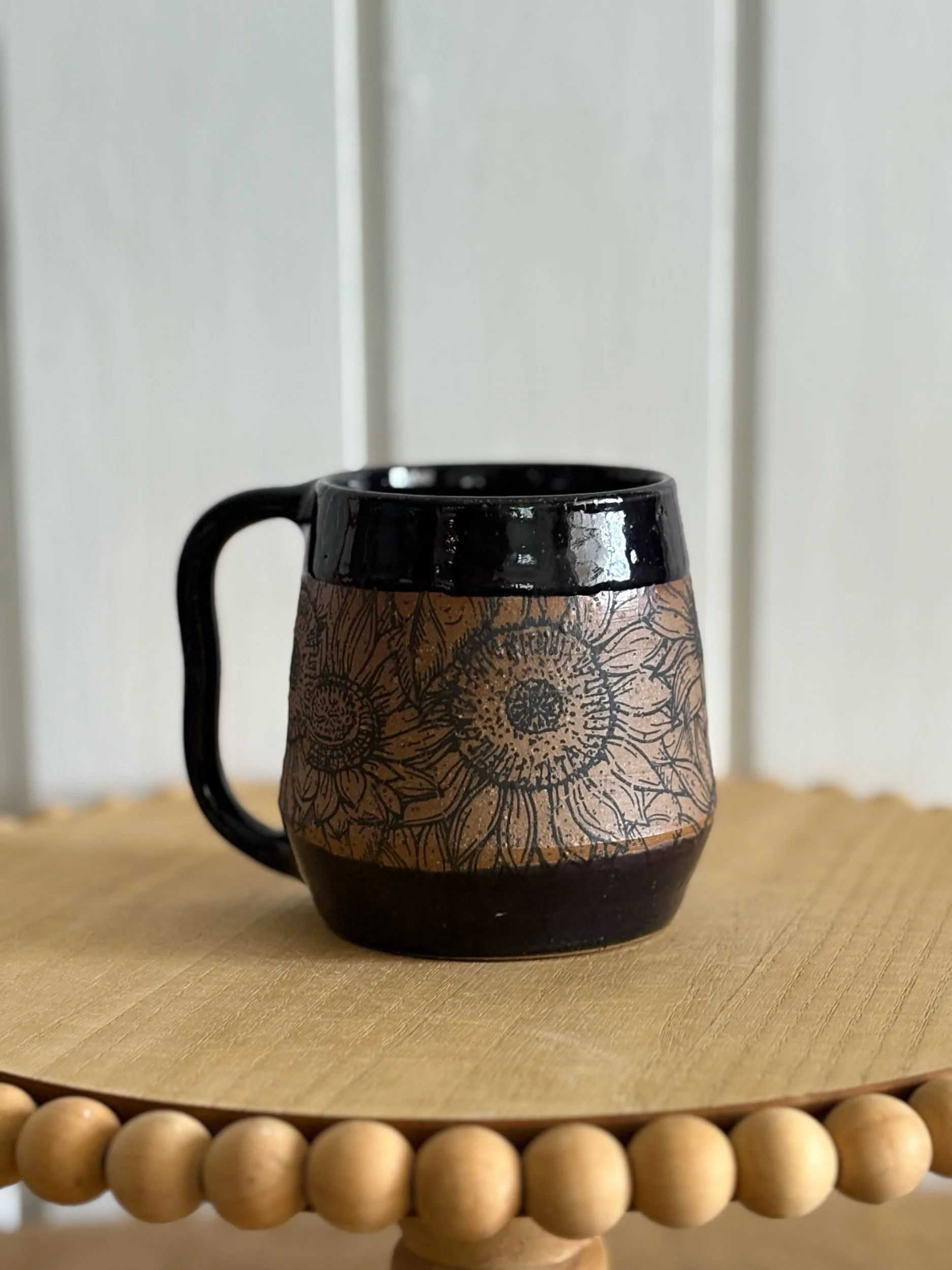 Handmade ceramic mug with sunflower underglaze transfer detail. Holds approximately 14oz of your favorite beverage.