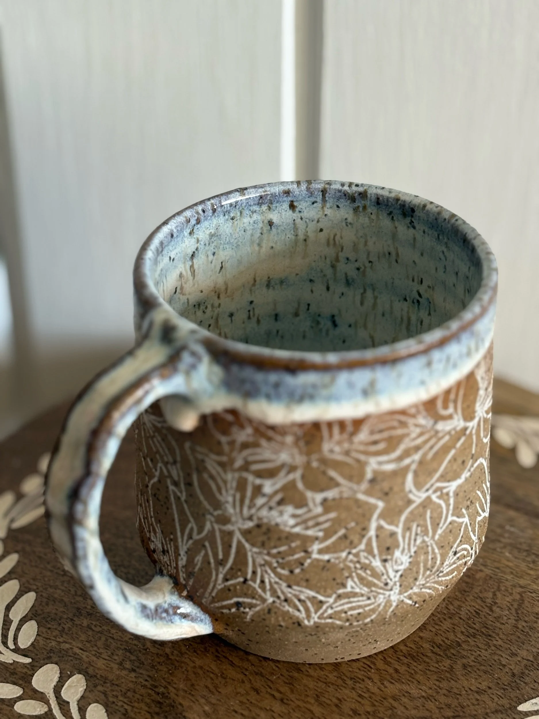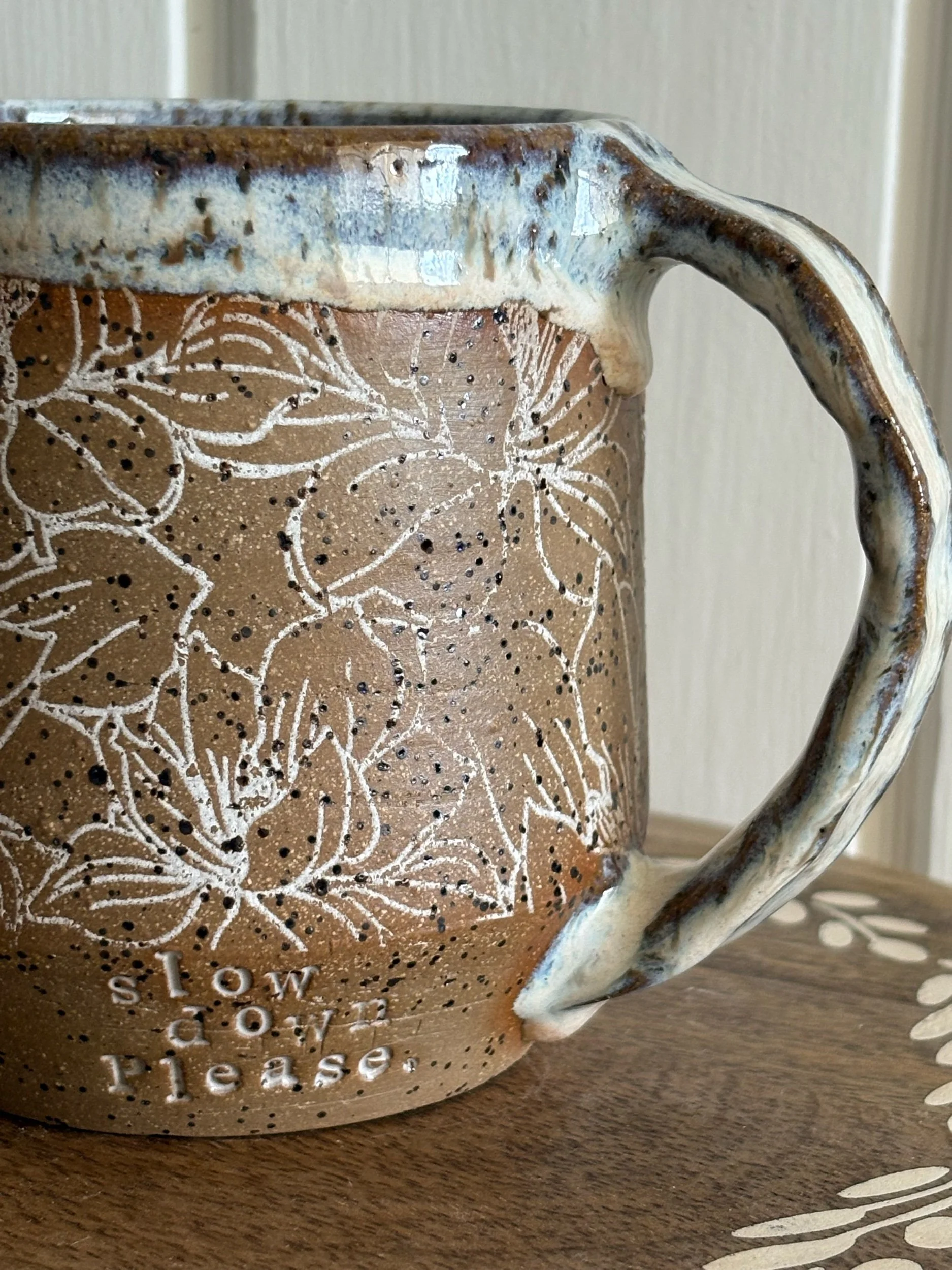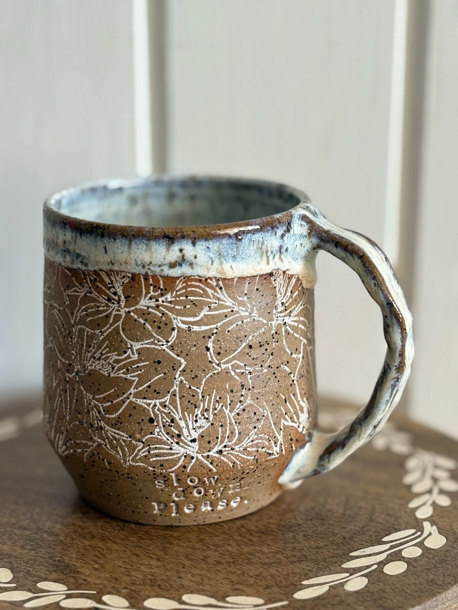 Handmade ceramic mug with slow down please stamped along bottom and magnolia underglaze detail. Holds approximately 15oz of your favorite beverage. Microwave and dishwasher safe.