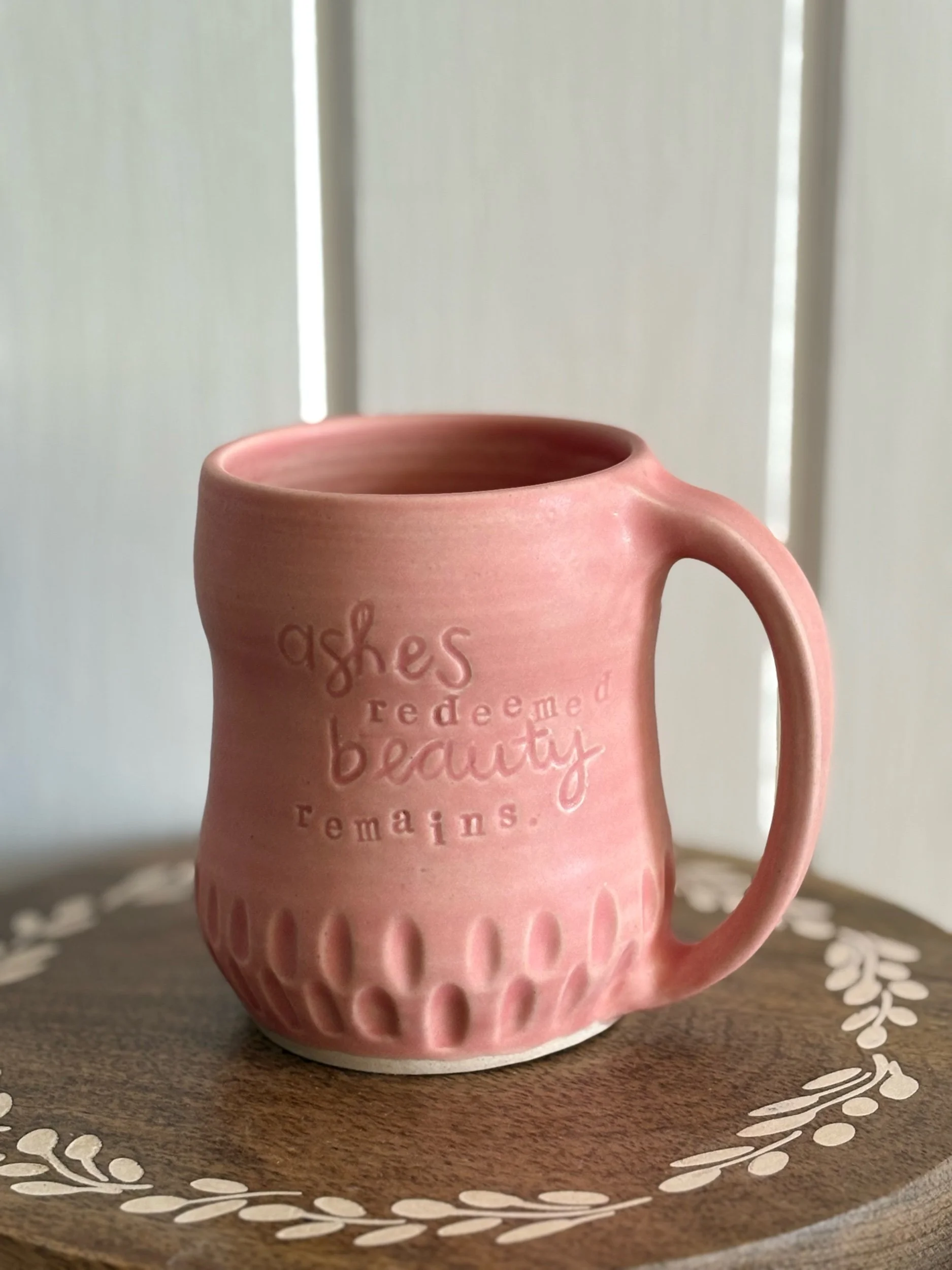 Handmade ceramic mug. Holds approximately 14oz of your favorite beverage. Ashes Redeemed Beauty Remains and carved detail. Microwave and Dishwasher safe.