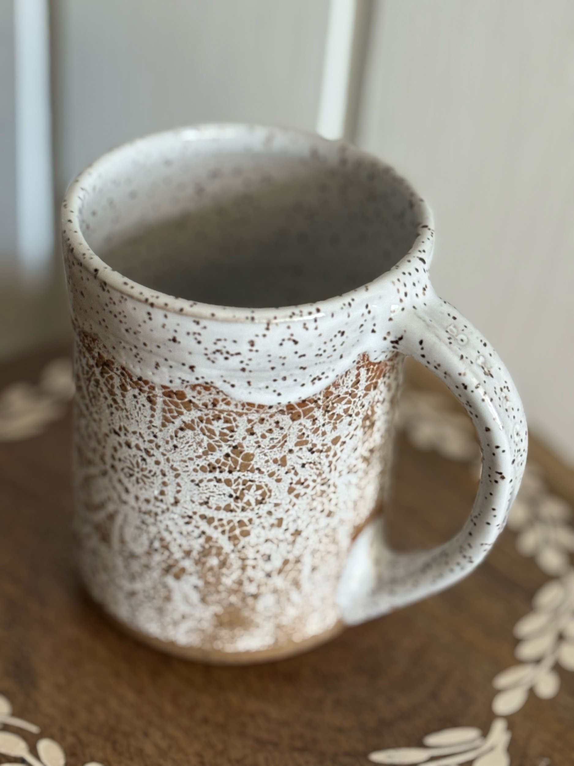Handmade ceramic mug with ‘grace’ stamped on handle and lace underglaze detail. Holds approximately 15oz of your favorite beverage. Microwave and dishwasher safe.