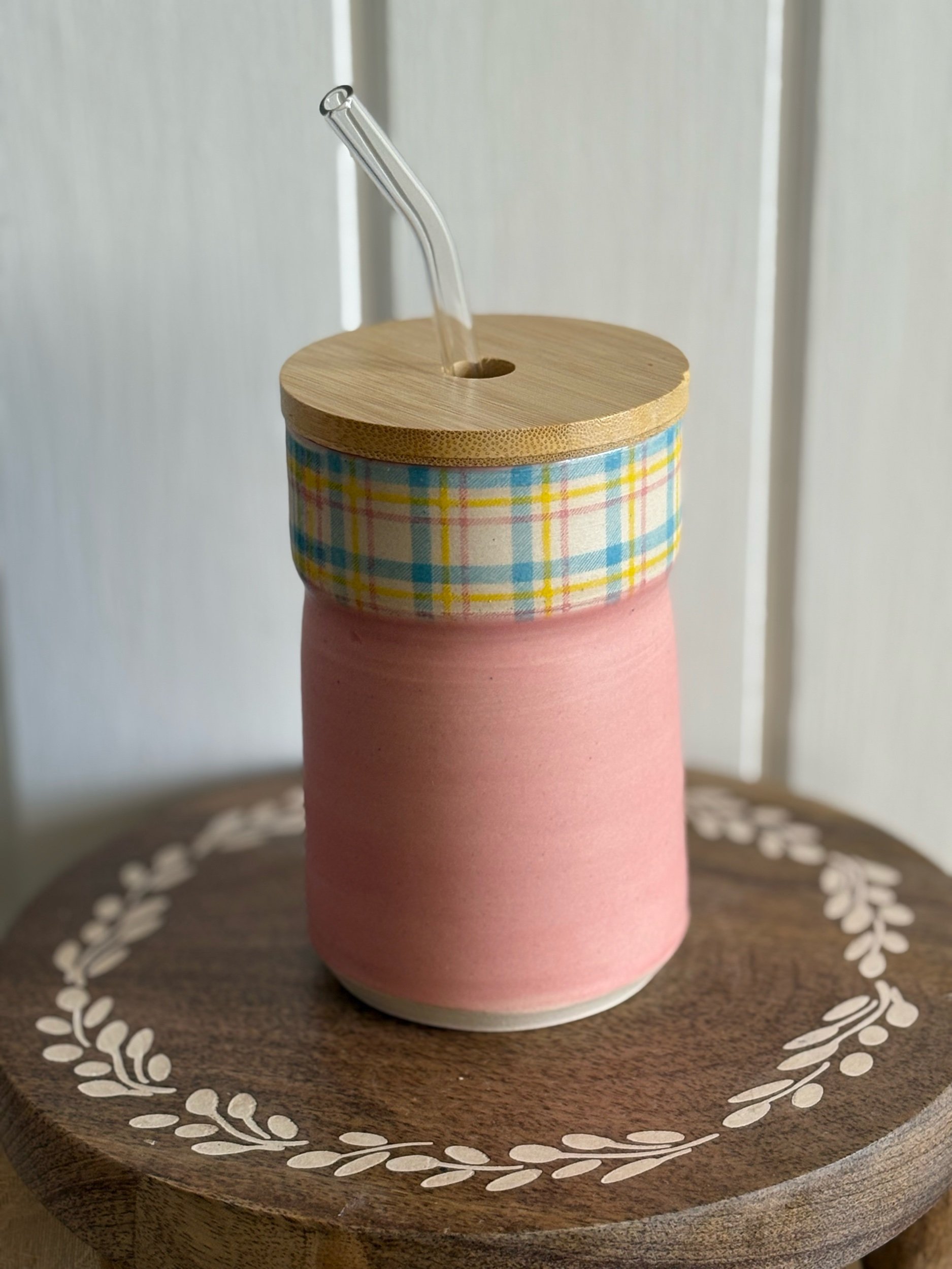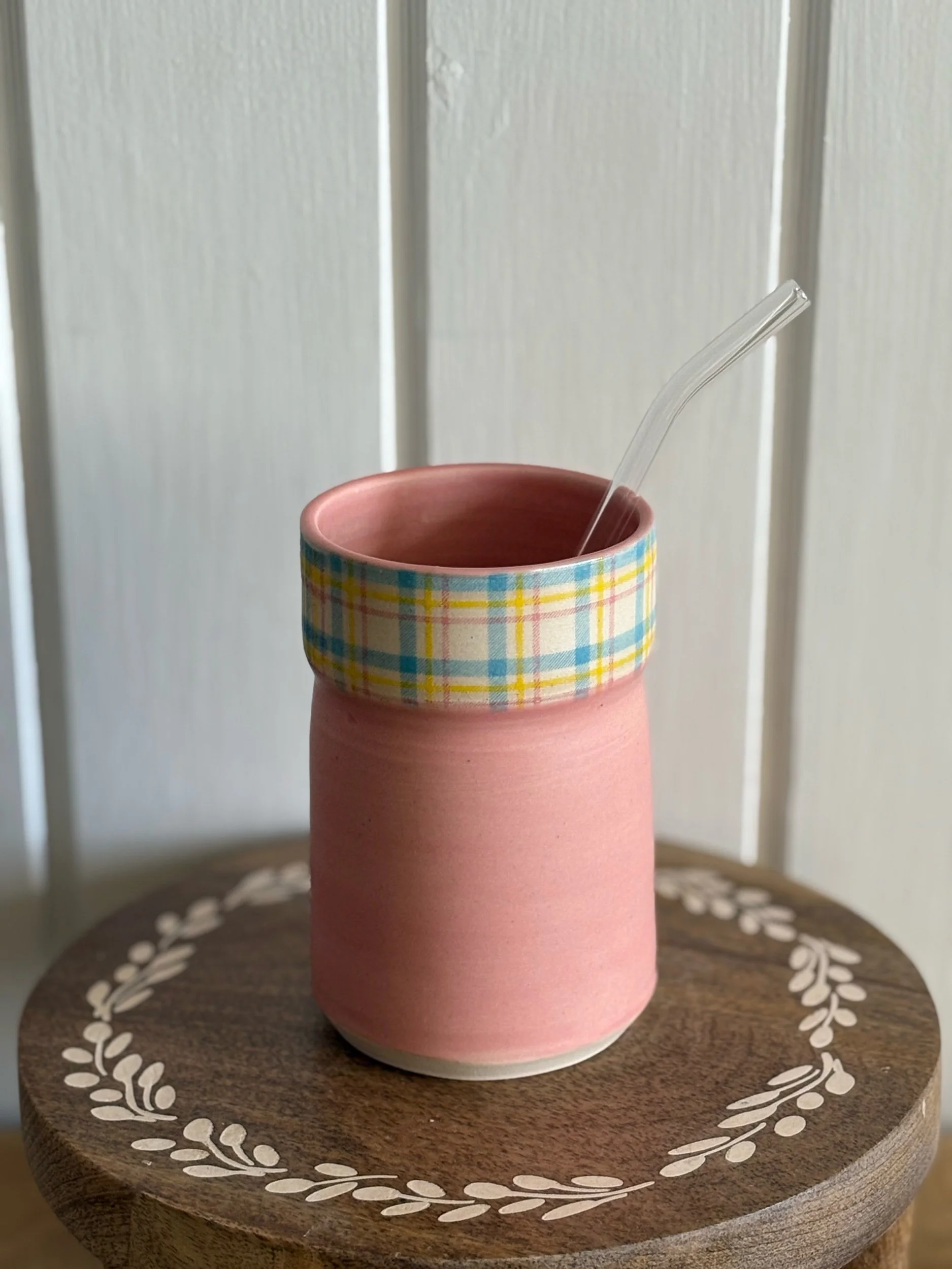 Handmade ceramic tumbler with a plaid underglaze detail. Holds approximately 16oz of your favorite beverage. Microwave and dishwasher safe
