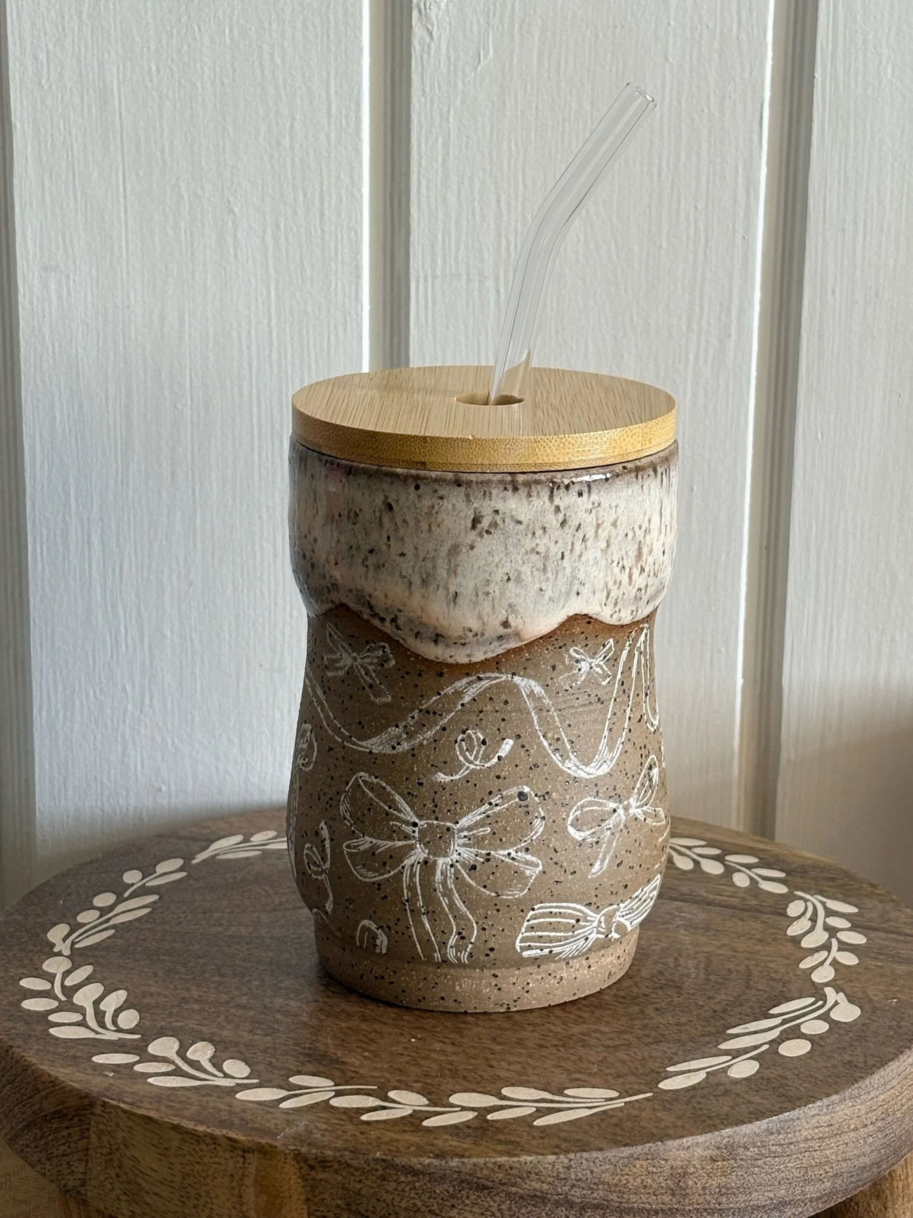 Handmade ceramic tumbler with bow underglaze details. Holds approximately 16oz of your favorite beverage. Microwave and dishwasher safe.