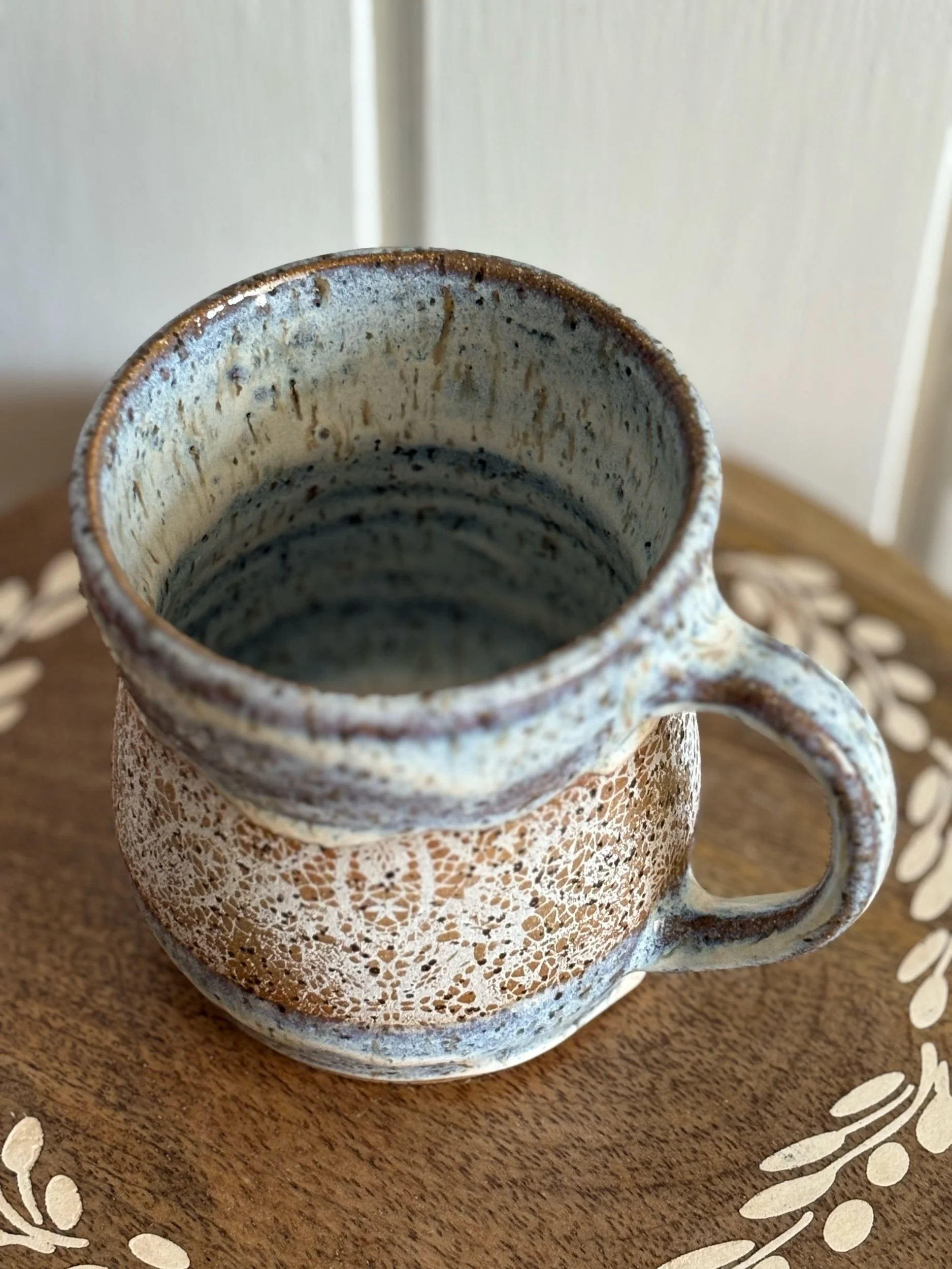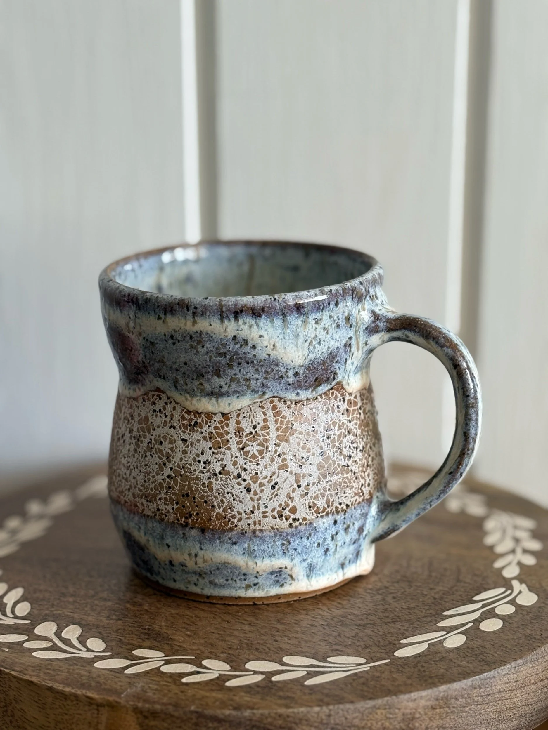 Handmade ceramic mug with magnolia underglaze detail. Holds approximately 15oz of your favorite beverage. Microwave and dishwasher safe.